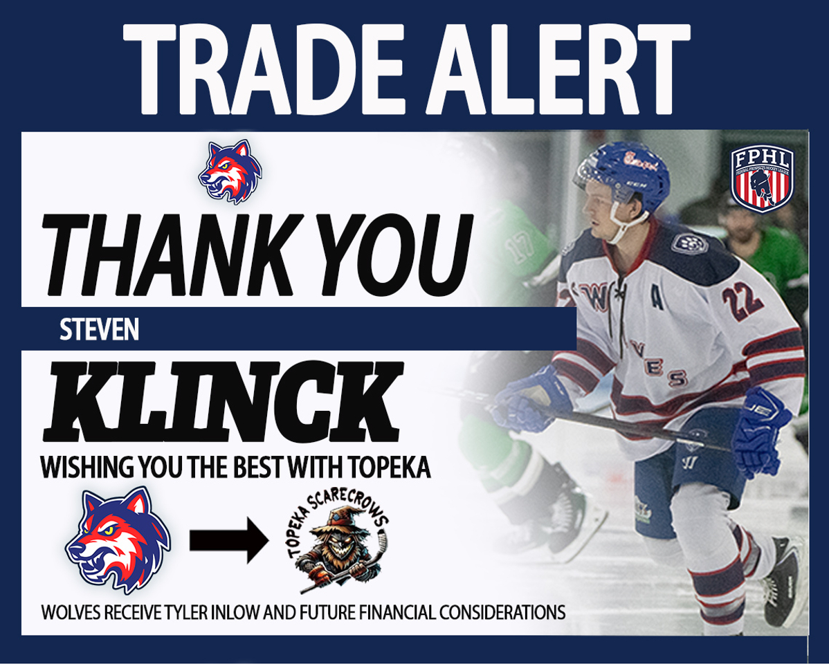 By request of the player, The Watertown Wolves have traded Steven Klinck to the Topeka Scarecrows. The Watertown Wolves organization would like to extend a heartfelt THANK YOU to Steven Klinck for the heart, grit, and passion he brought to the ice every single night — every shift, every battle, every moment in a Wolves sweater.